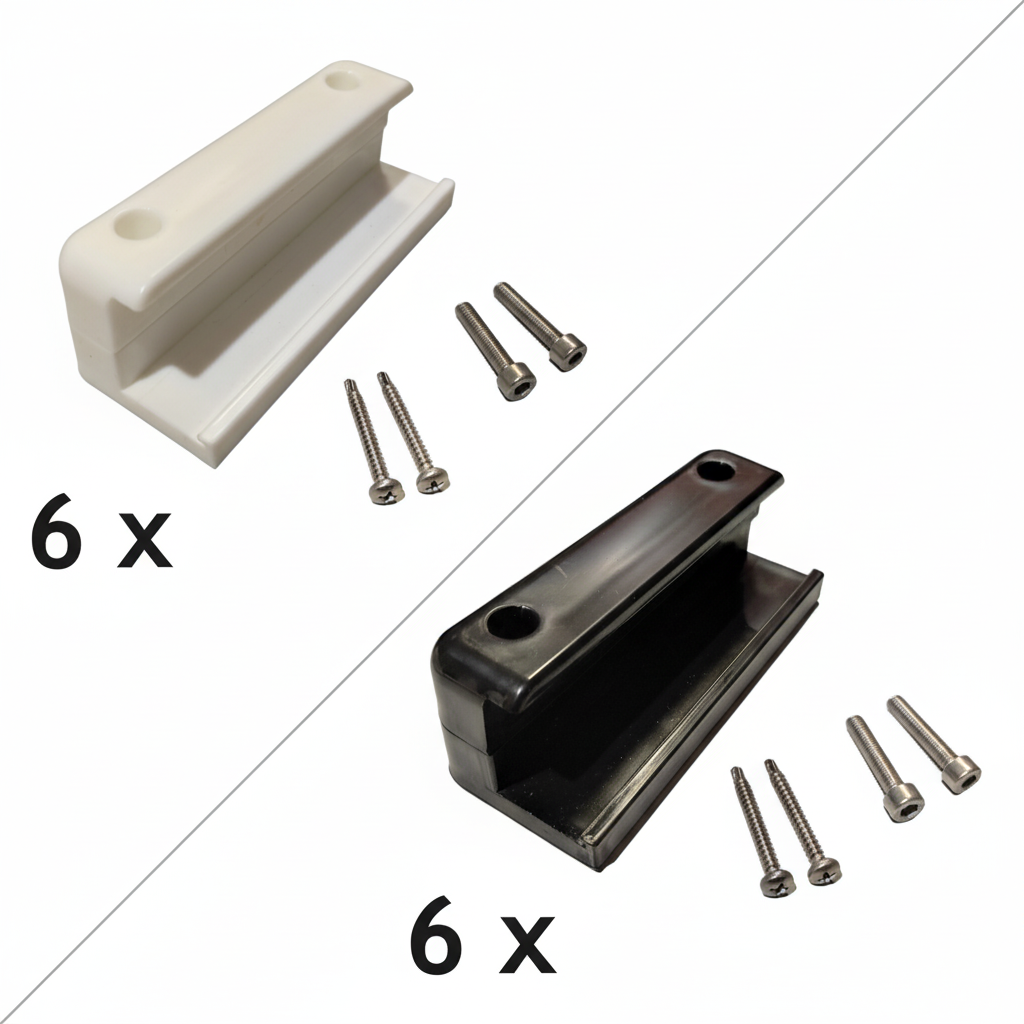 Peças em PP, o conjunto inclui 6 peças de fixação, e os respetivos parafusos em aço inoxidável.